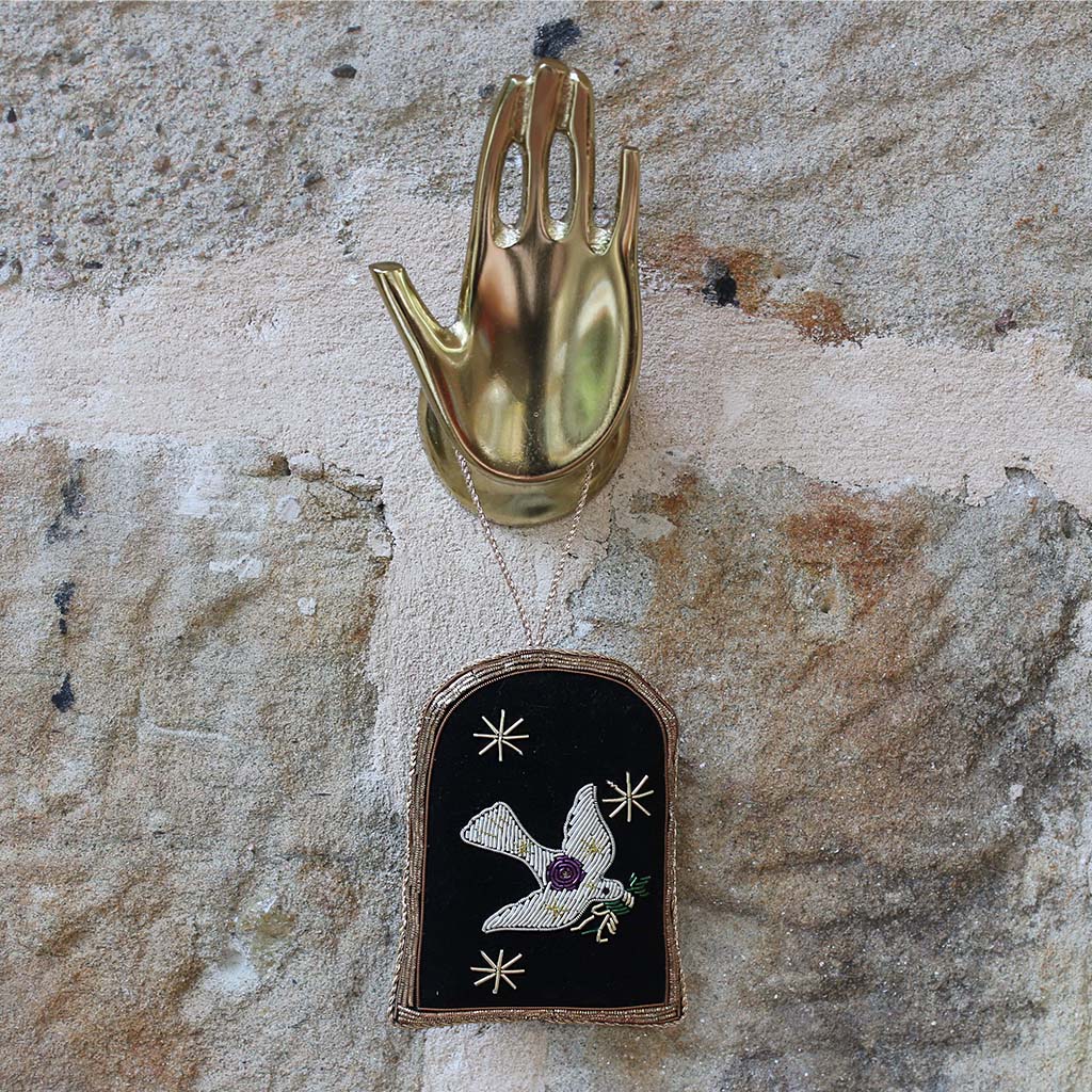 Chaque suspension est entièrement brodée à la main en Inde. De légères variations peuvent apparaître d’une pièce à l’autre : elles sont la signature du geste artisanal et la promesse d’un objet unique.