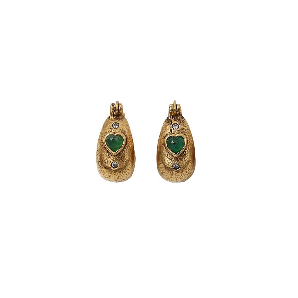 Créoles en laiton bain d’or, 1 micron d’or 999/1000, pierres semi-précieuses et strass Swarovski. Tiges en argent massif. Pierre centrale en forme de coeur et base laiton sablé.