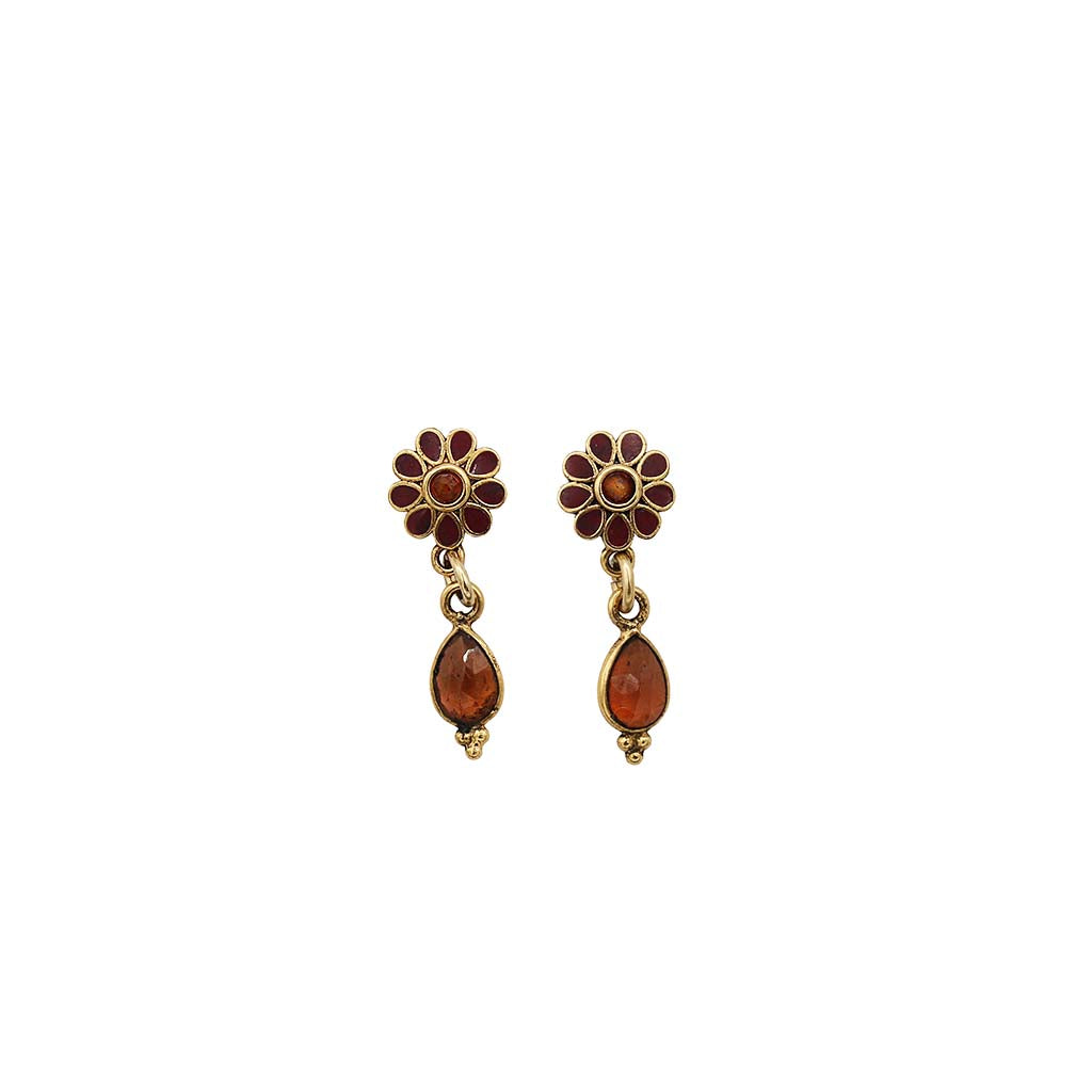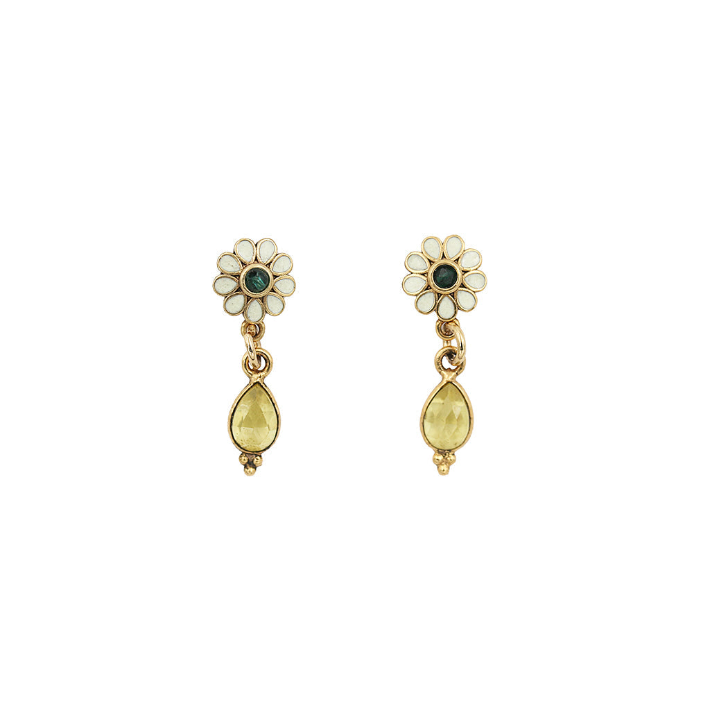 Boucles d’oreilles en laiton bain d’or, 1 micron d’or 999/1000, émail ivoire et pierres semi-précieuses. Disponible en émail bordeaux / goutte Hessonite ou émail ivoire / goutte Citrine.