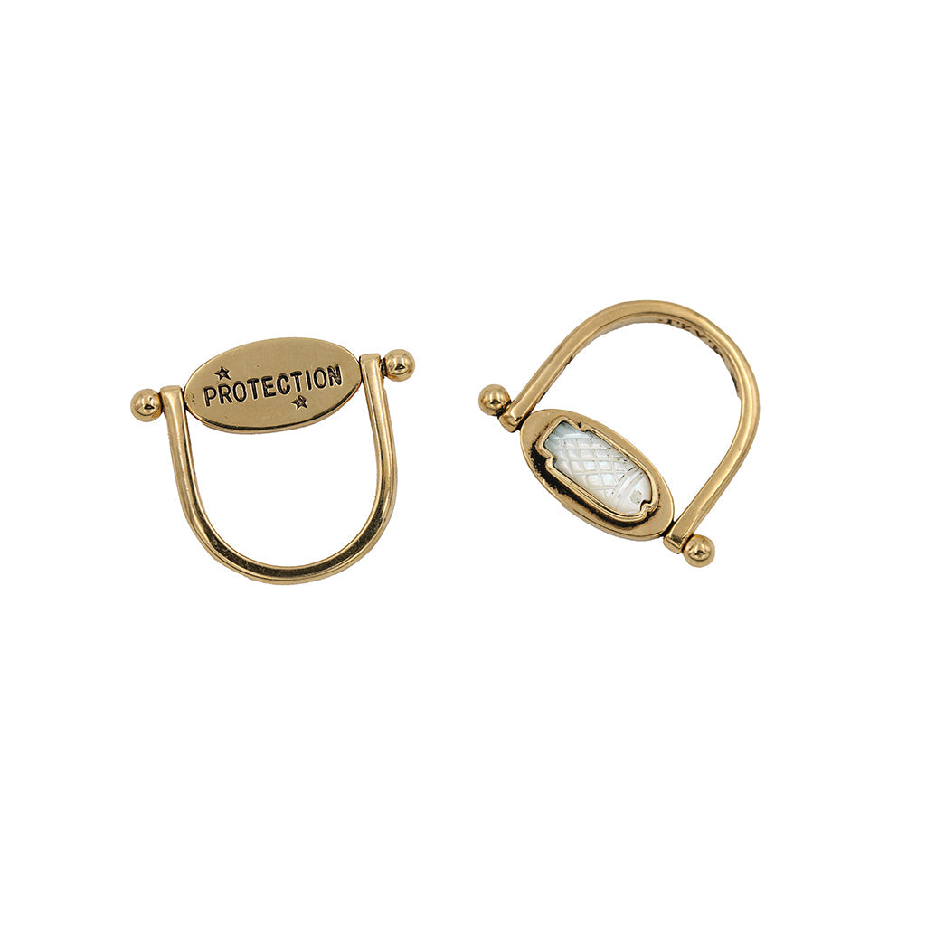 Gold-plated brass ring (3 microns) with a hand-cut semi-precious stone in the shape of a fish. Also available in mother-of-pearl and serpentine. The reverse features a "protection" message.