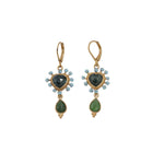 Gold-plated brass earrings (1 micron of 999/1000 gold), enamel, and semi-precious stones. Available in sky blue enamel/blue tourmaline/serpentine drop or burgundy enamel/serpentine/amethyst drop. Dimensions: 40/16 mm.