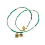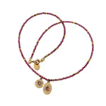 A string of stones and medallions in gold-plated brass, featuring teardrop and heart-shaped stones and Swarovski crystals. Available in faceted raw ruby, pink tourmaline, green agate, or mother-of-pearl. Chain length: 42 cm. Medallions: 1 x 1 cm and 1.5 x 1 cm.