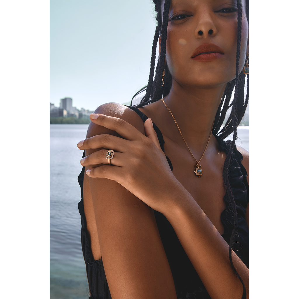 Gold-plated brass ring, 3 microns of 999/1000 gold, semi-precious stones, and Swarovski crystal. Available in Citrine, Hessonite, and Pyrite. Dimensions: 1 x 1.2 cm. Non-adjustable. Available in sizes 50 to 56.