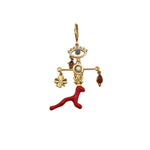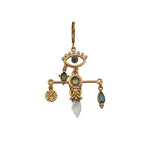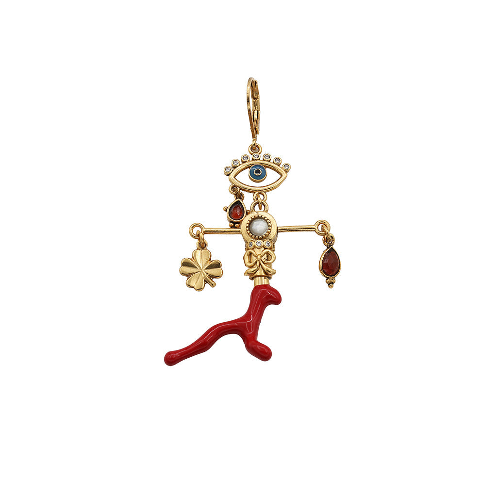Single earring in gold-plated brass (1 micron of 999/1000 gold), enamel, and semi-precious stones. Available in red enameled metal / Hessonite / Mother-of-pearl / Swarovski crystal. Dimensions: 5.5 x 3 cm. Also available in Mother-of-pearl / blue glass / blue enamel / Swarovski crystal / Indicolite tourmaline. Dimensions: 4.5 x 3 cm.