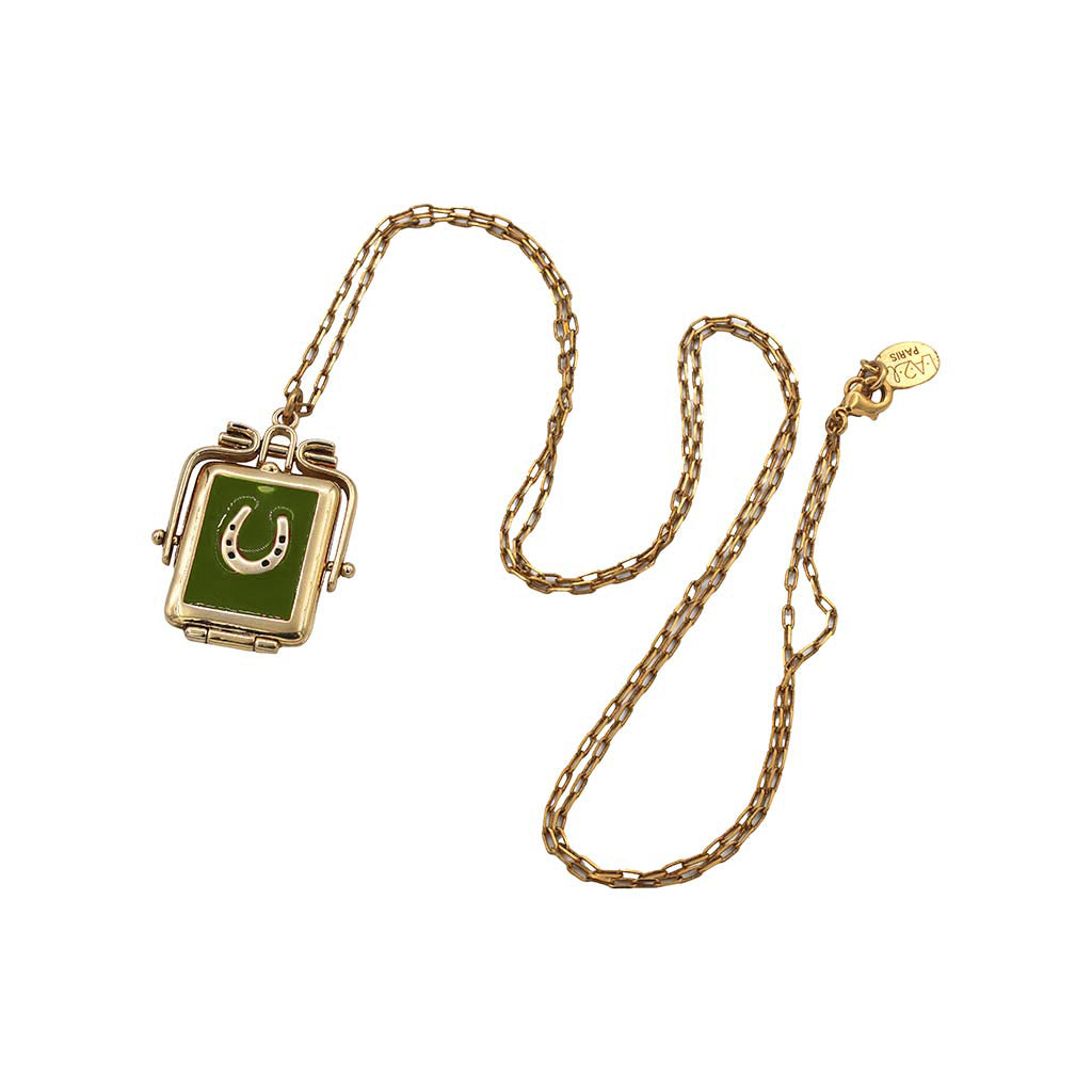 Gold-plated brass necklace, 1 micron of 999/1000 gold and enamel. Box with horseshoe symbol and enameled clover interior with the inscription "Chance". Available in ivory or brick enamel. Chain length: 72 cm.