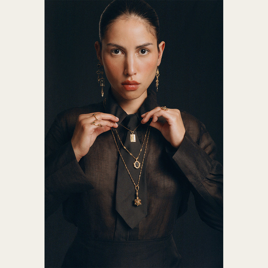 Sautoir en laiton bain d’or, 1 micron d’or 999/1000, et amulettes en pierres semi-précieuses.