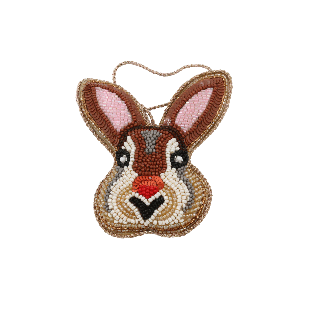 Tête de lapin brodé à la main en perles roses, dorées, nacrées et violettes. Une touche tendre et joyeuse à suspendre.