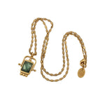 Collier pivot double faces en laiton bain d’or 1 micron d’or 999/1000 et pierres semi-précieuses. La face 1 est une carte de tarot « force » avec 4 points d’émail émeraude. La face 2 une pierre semi précieuse facettée Péridot, Tourmaline bleue ou Hessonite.
