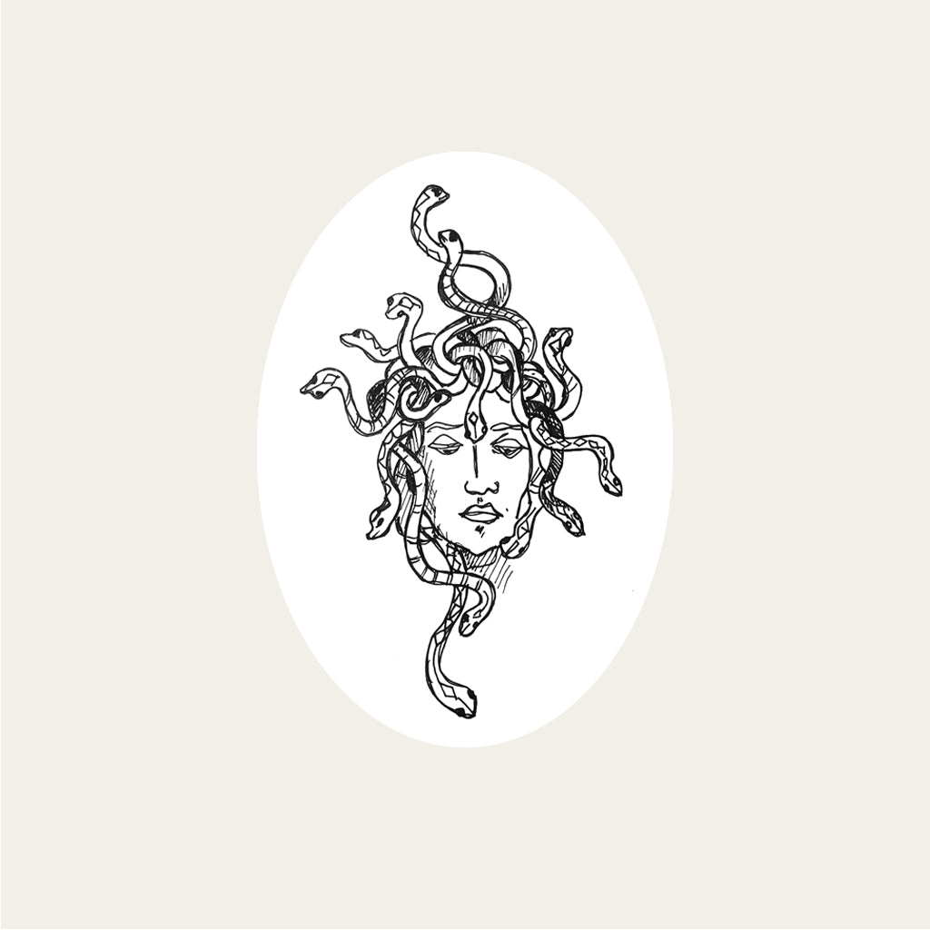 Méduse, ses yeux ont le pouvoir de pétrifier tout mortel qui croise son regard. C’est Athéna qui jalouse a transformé Méduse, car Poseidon l’avait charmé dans un de ces temples. C’est une figure féminine forte de la mythologie grecque. Elle représente le pouvoir féminin, la liberté et la transformation. Le visage de médusa est souvent considéré comme une amulette protectrice qui éloignerait le mal. À retrouver dans la collection:
