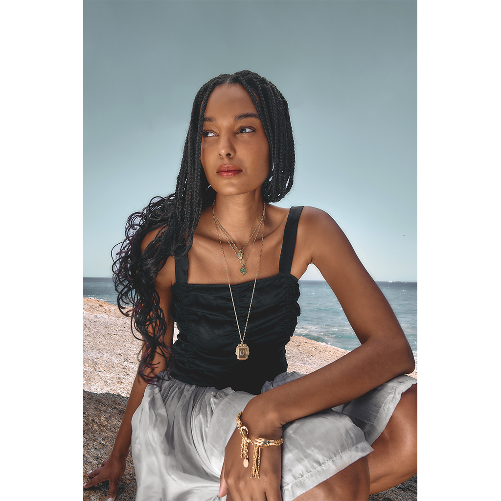 Dans la collection Camay, nous avons prit le parti de mettre en valeur les pierres et leurs significations. Un serti et une bélière travaillés, inspiré des bijoux antiques, mais qui disparaissent avec l’éclat des quatre pierres taillées.