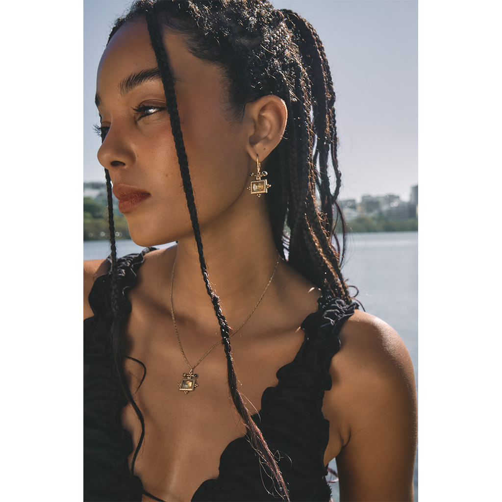 Boucles d’oreilles en laiton bain d’or, 1 micron d’or 999/1000, et pierres semi-précieuses. Base laiton sablé. Disponible en Citrine, Pyrite et Hessonite. Dimensions : 3 / 2 cm. Pour vous aider à choisir votre pierre, voici notre guide.