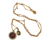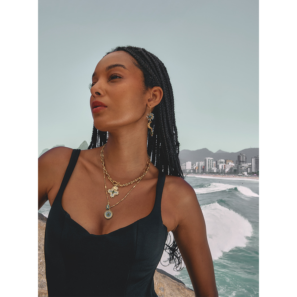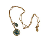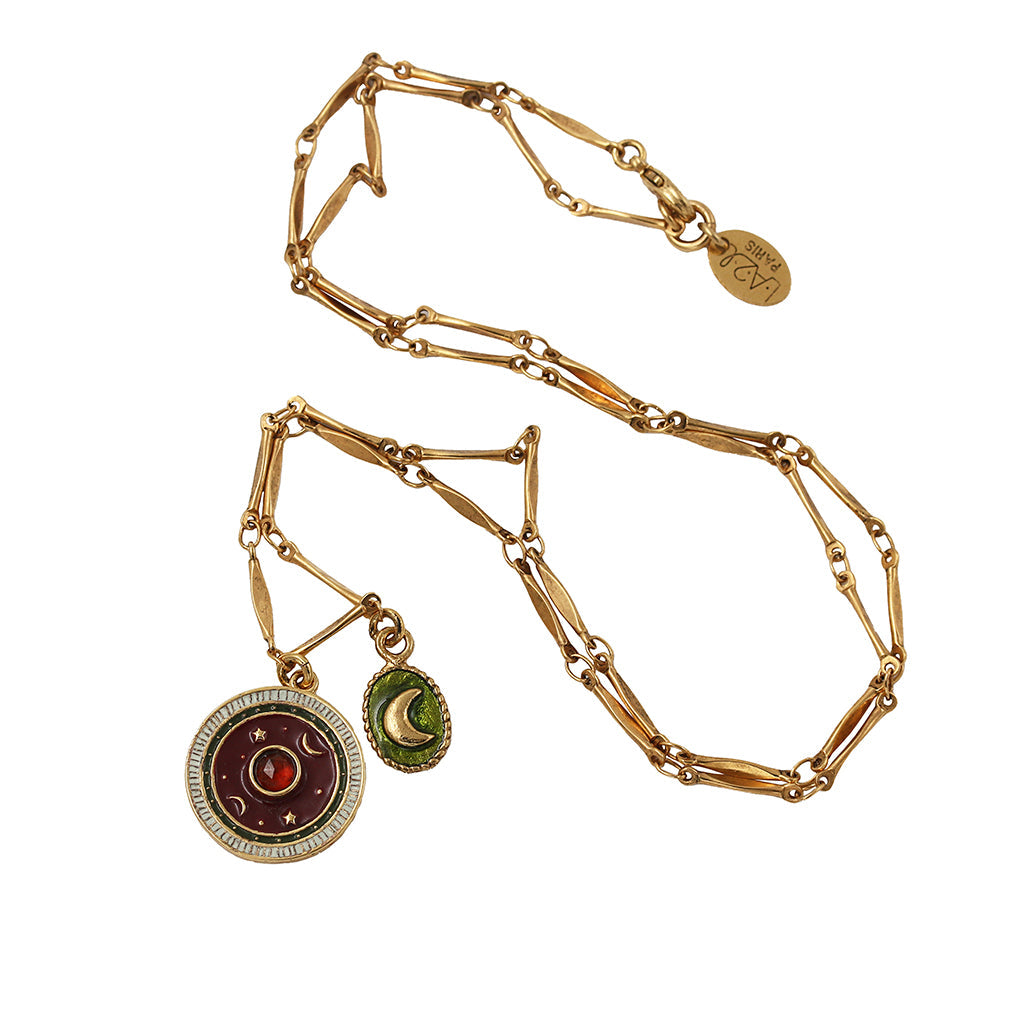 Collier en laiton bain d’or, 1 micron d’or 999/1000, émail et pierres semi-précieuses. Disponible en émail rouge / Grenat ou émail bleu / Serpentine. Verso oeil émaillé noir et blanc. Longueur de la chaîne : 54 cm, diamètre du médaillon : 18 mm. Pour vous aider à choisir votre pierre, voici notre guide.